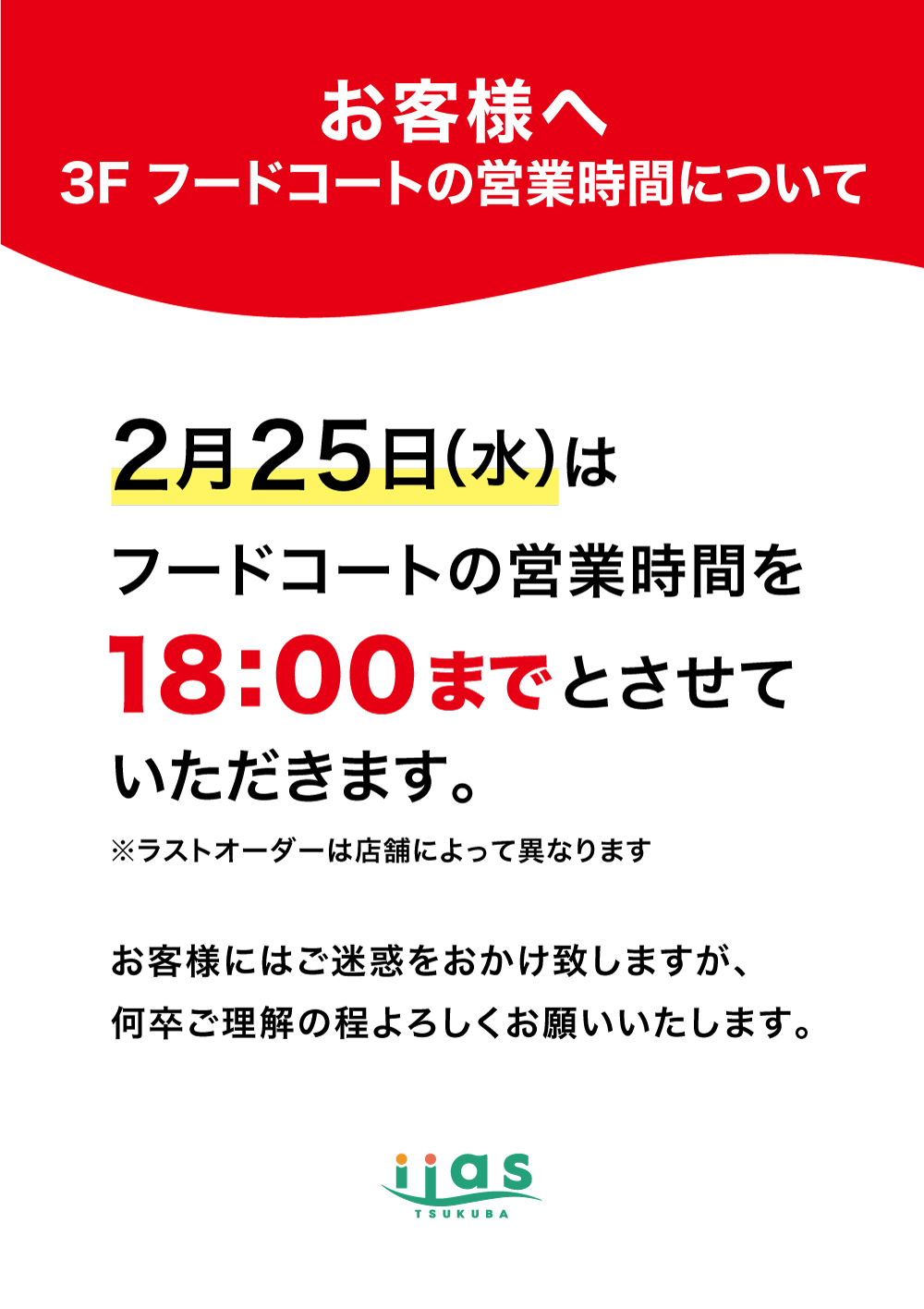 2月25日(水)3Fフードコートの営業時間