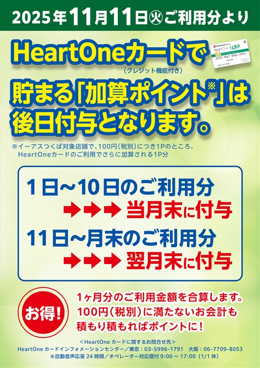 HeartOneカード(クレジット機能付き)で貯まる「加算ポイント」は後日付与となります。