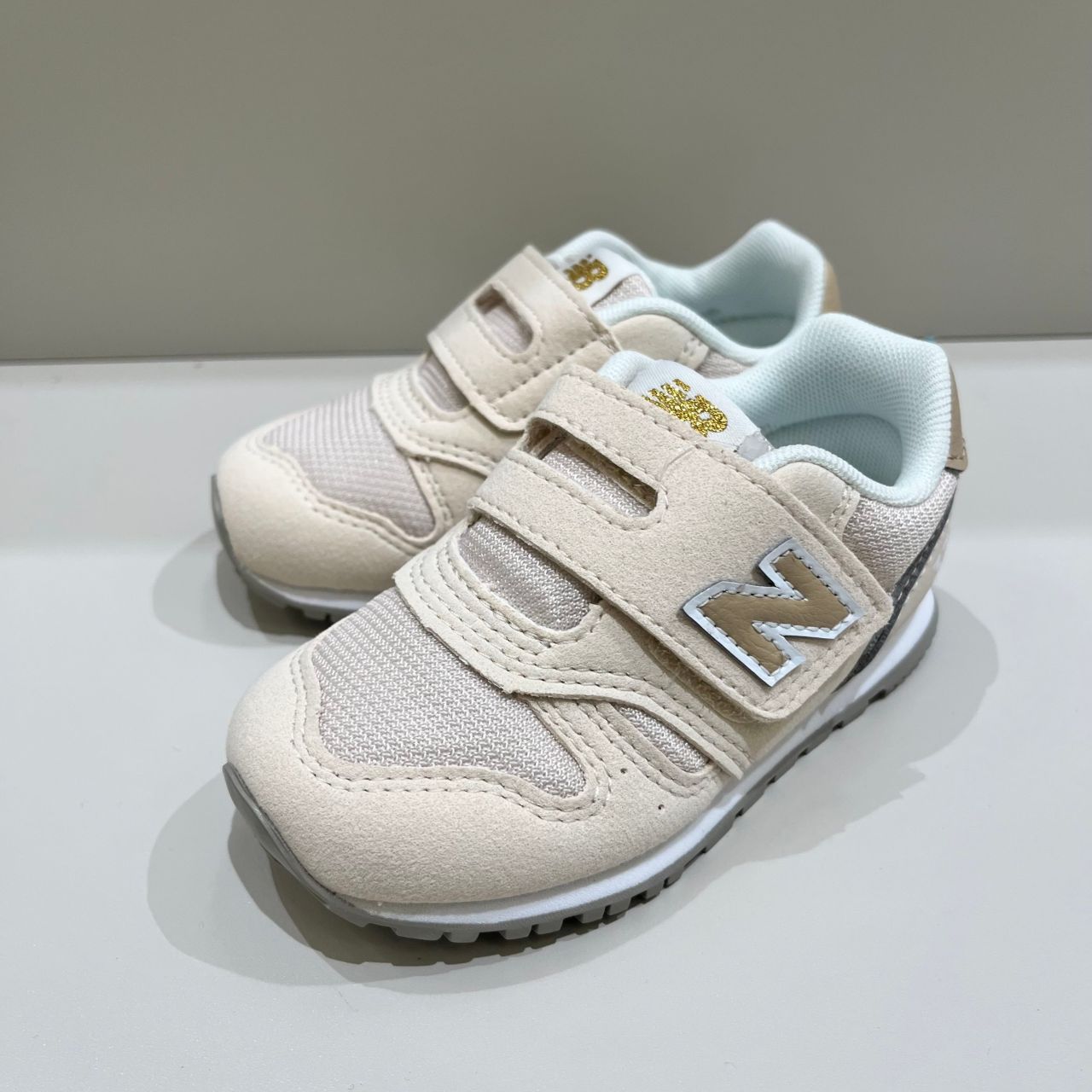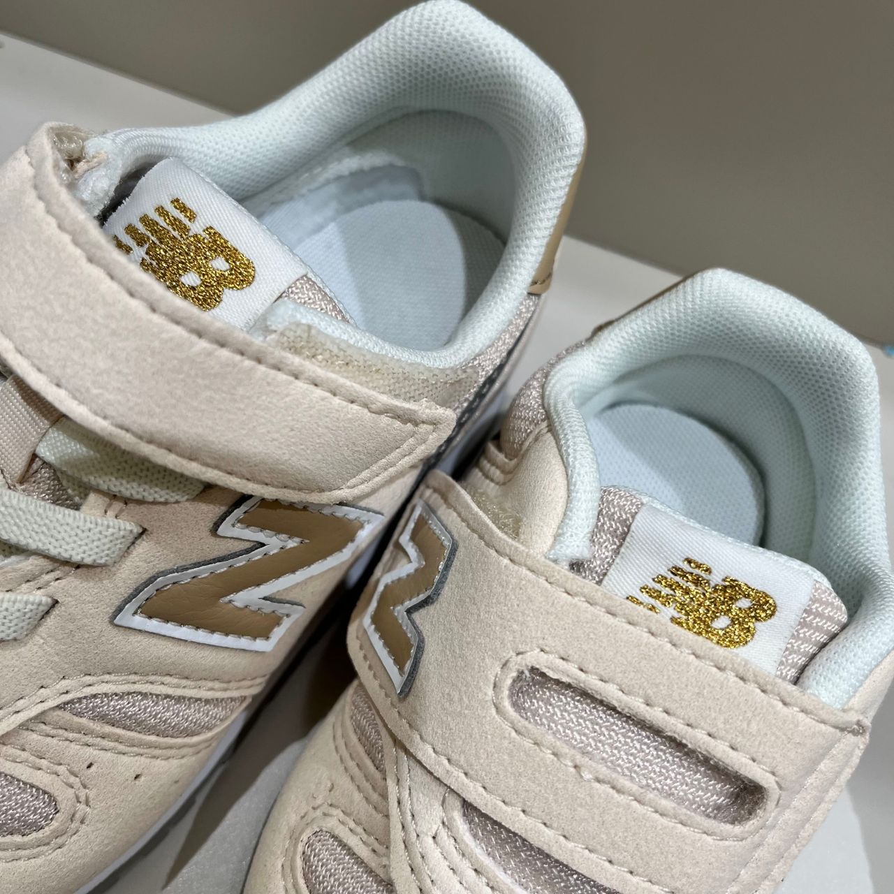ラメ入りゴールドのNBロゴがキラッと光って