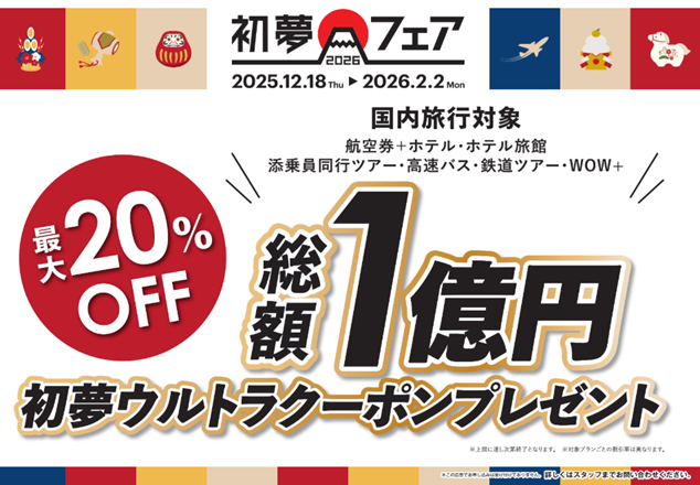 エイチアイエスでは、1年で一番のビックイベントである【初夢フェア】を開催! 初夢フェア開催期間:12月18日(木)~2026年2月2日(月) なお、12/18㈭は、9:00より電話受付スタート! ◆商品別受付スケジュールは こちら イーアスつくば営業所でも、9:00より電話受付致しますので、 ぜひ皆様のお問い合わせお待ちしております! 電話番号:050-1752-3717