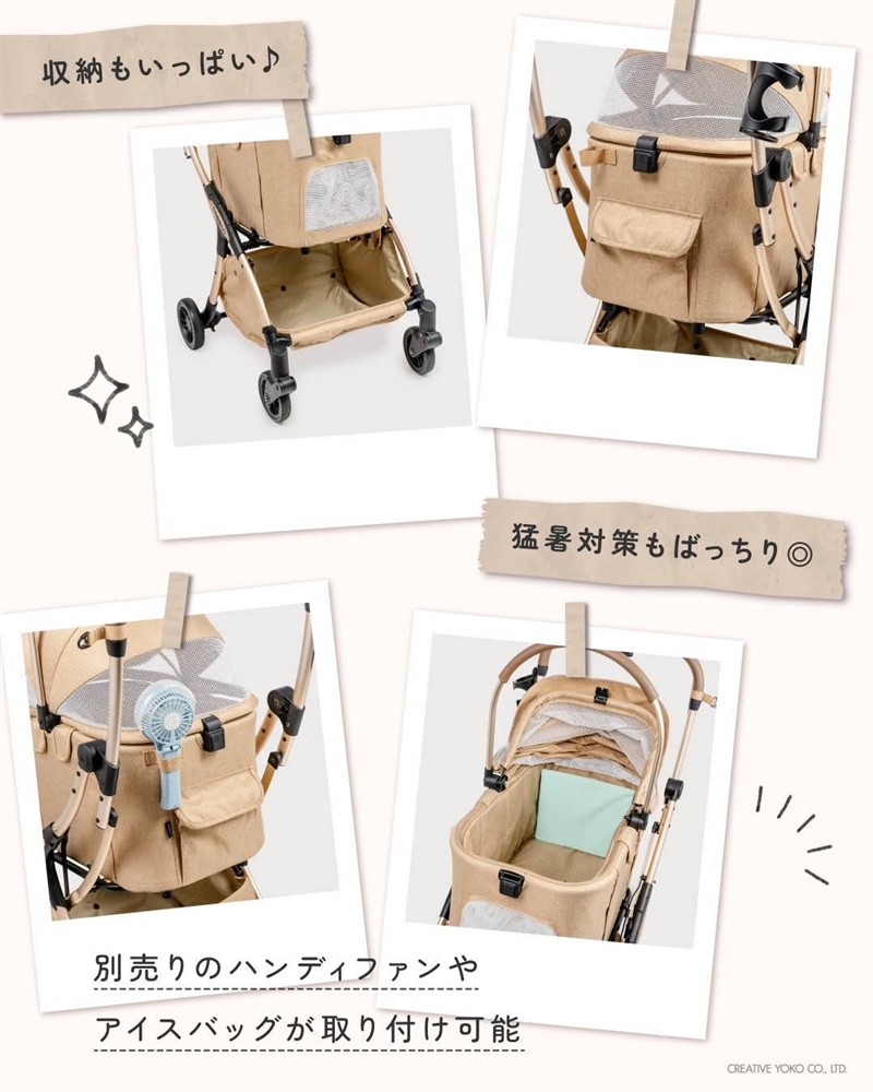 その他にもサスペンション付きタイヤによる安全走行や 開け閉め簡単ワンロック仕様、 片手で楽々折りたたみ構造など、 嬉しいこだわりが盛りだくさん☆