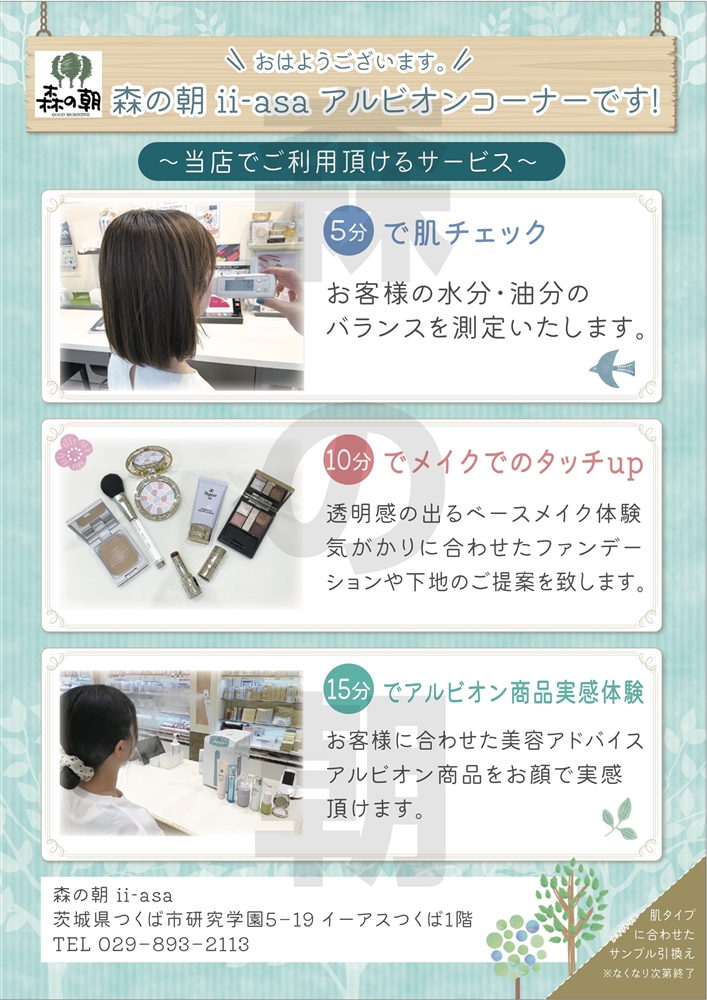 【1階森の朝 アルビオンコーナー】アルビオンのメイクやスキンケアをお顔で体感してみませんか?